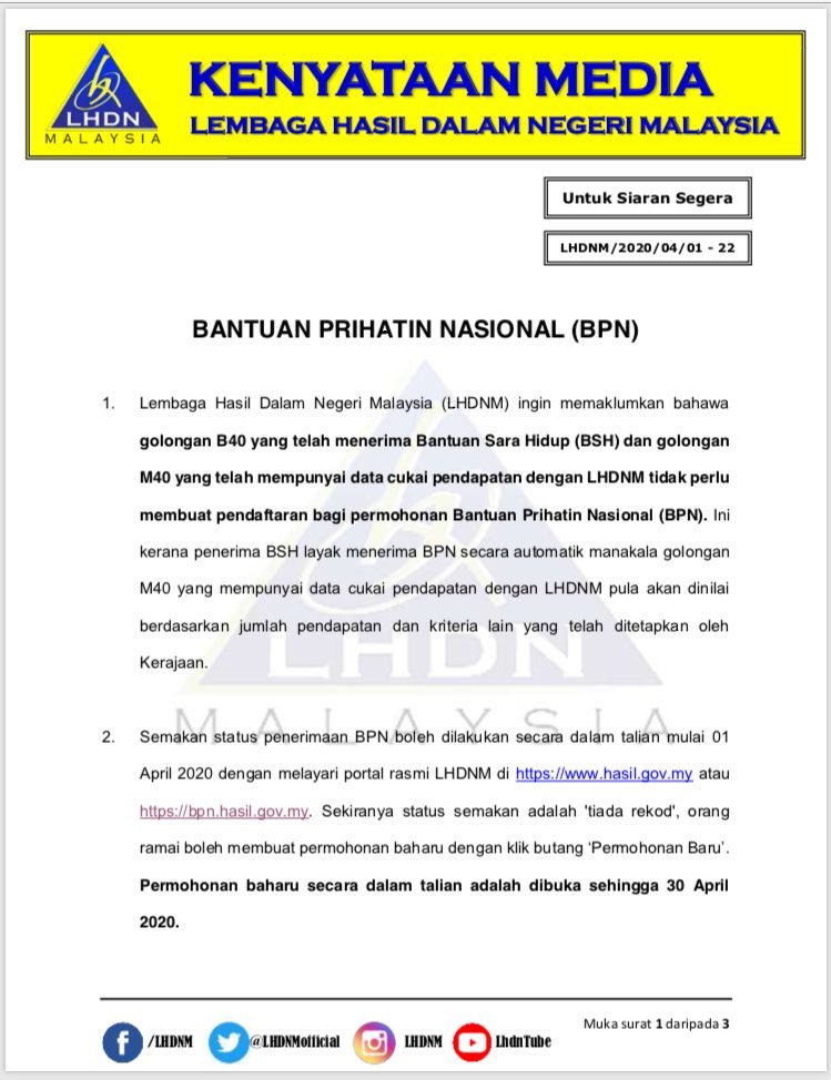 Selain B40 Bantuan Prihatin Nasional BPN turut akan diberikan kepada golongan M40. Lhdn Bantuan Prihatin Nasional. 2 days agoJan 14 2022 Semakan.